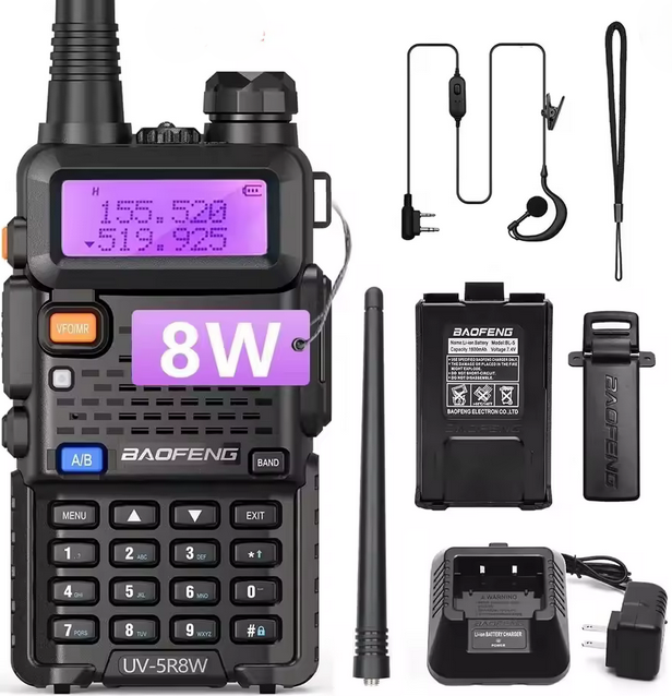 BaoFeng UV-5R 8W to kompaktowy i wytrzymały radiotelefon ręczny oferujący trzy poziomy mocy nadawczej (1 W / 4 W / 8 W), obsługę dwóch pasm VHF/UHF, 128 kanałów oraz funkcje takie jak VOX, latarka LED czy alarm. To niezastąpione narzędzie dla radioamatorów, służb terenowych, survivalowców i użytkowników rekreacyjnych.